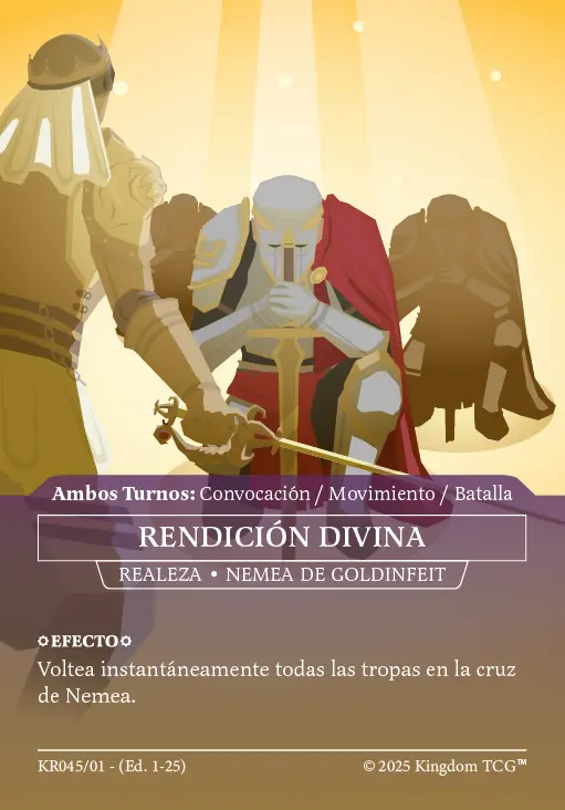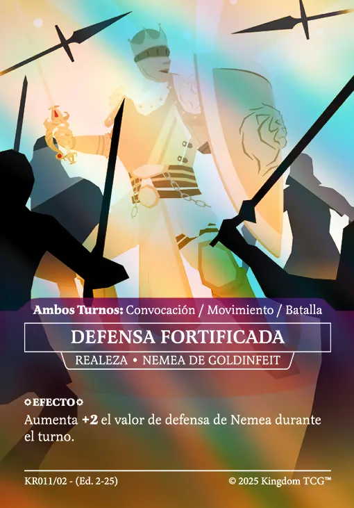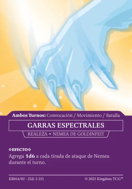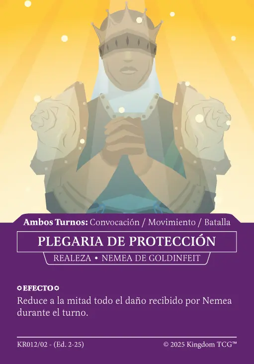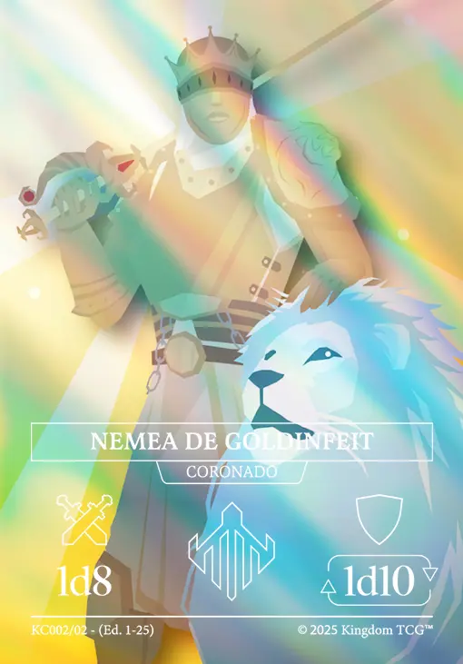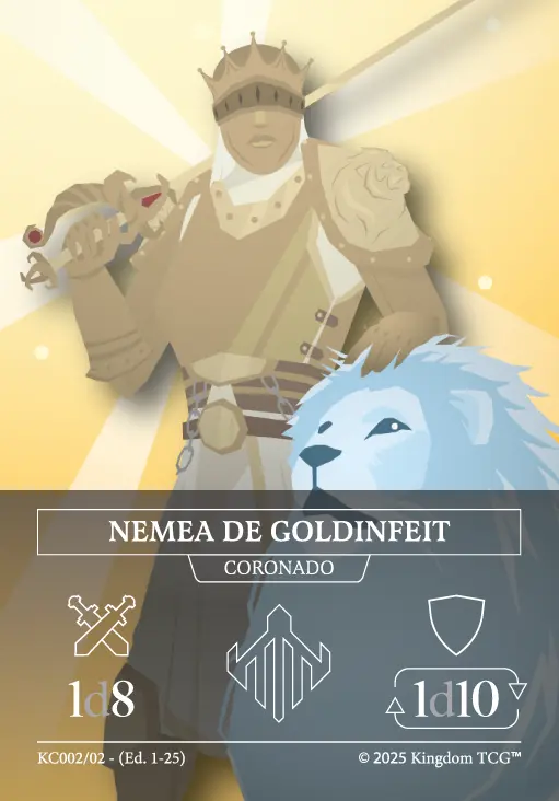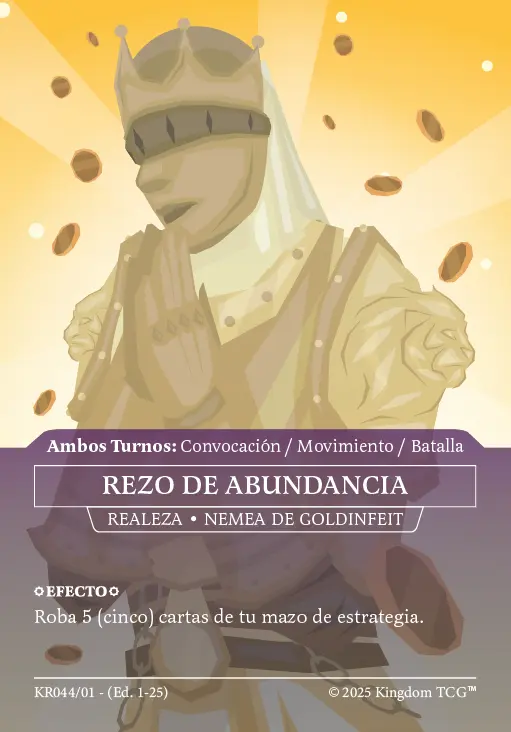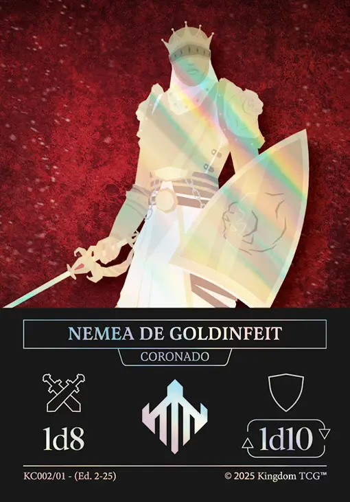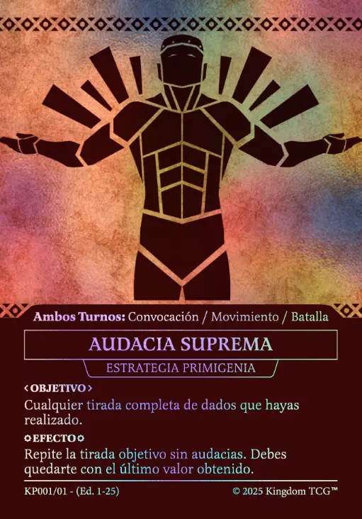 - Espacio 5: Estrategia Primigenia. Las "estrategias primigenias" son los nuevos tipos de carta de Kingdom TCG™ y son exclusivas de los kits de coronado (al menos hasta el momento). Vienen en 3 rarezas distintas: Común, Holo, y Shadow Gold. El slot de estrategia primigenia puede contener cualquiera de las 3 rarezas posibles.